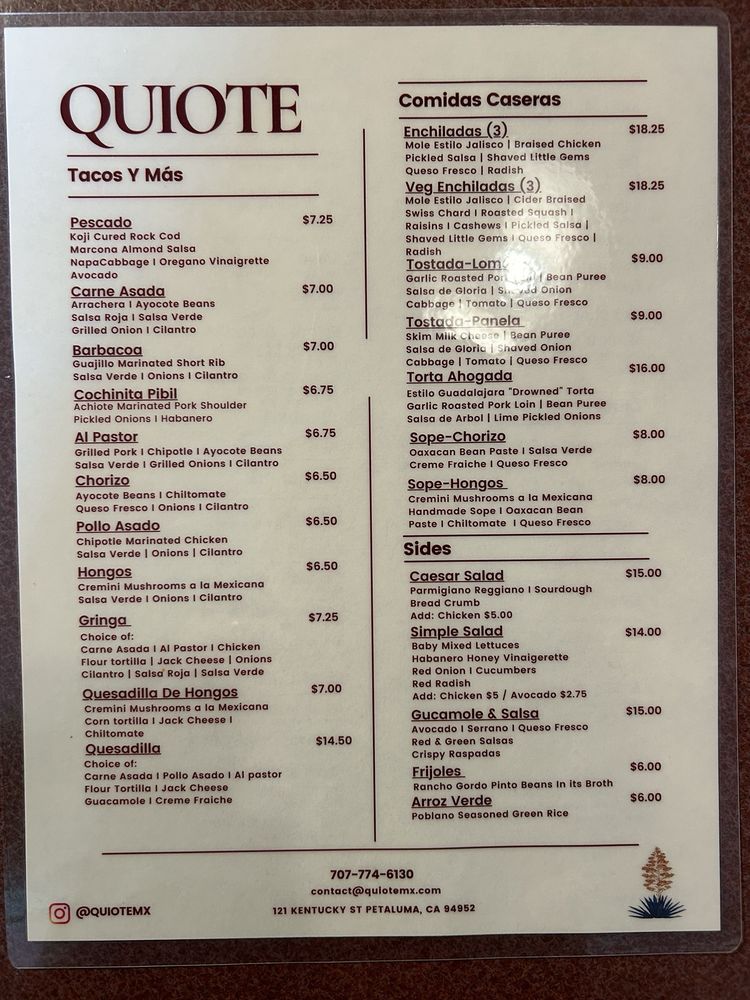 Quiote, a Mexican restaurant located in Petaluma, CA, offers a unique dining experience with a focus on smaller plates meticulously prepared. The menu boasts delicious options such as barbacoa tacos, sope chorizo, and mole enchiladas. Customers rave about the flavorful dishes and the warm service provided by the staff.